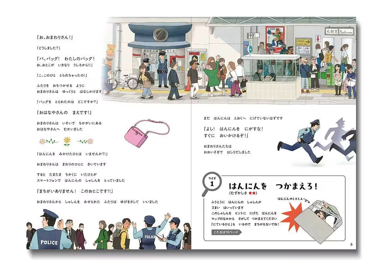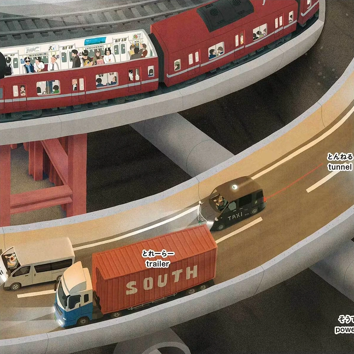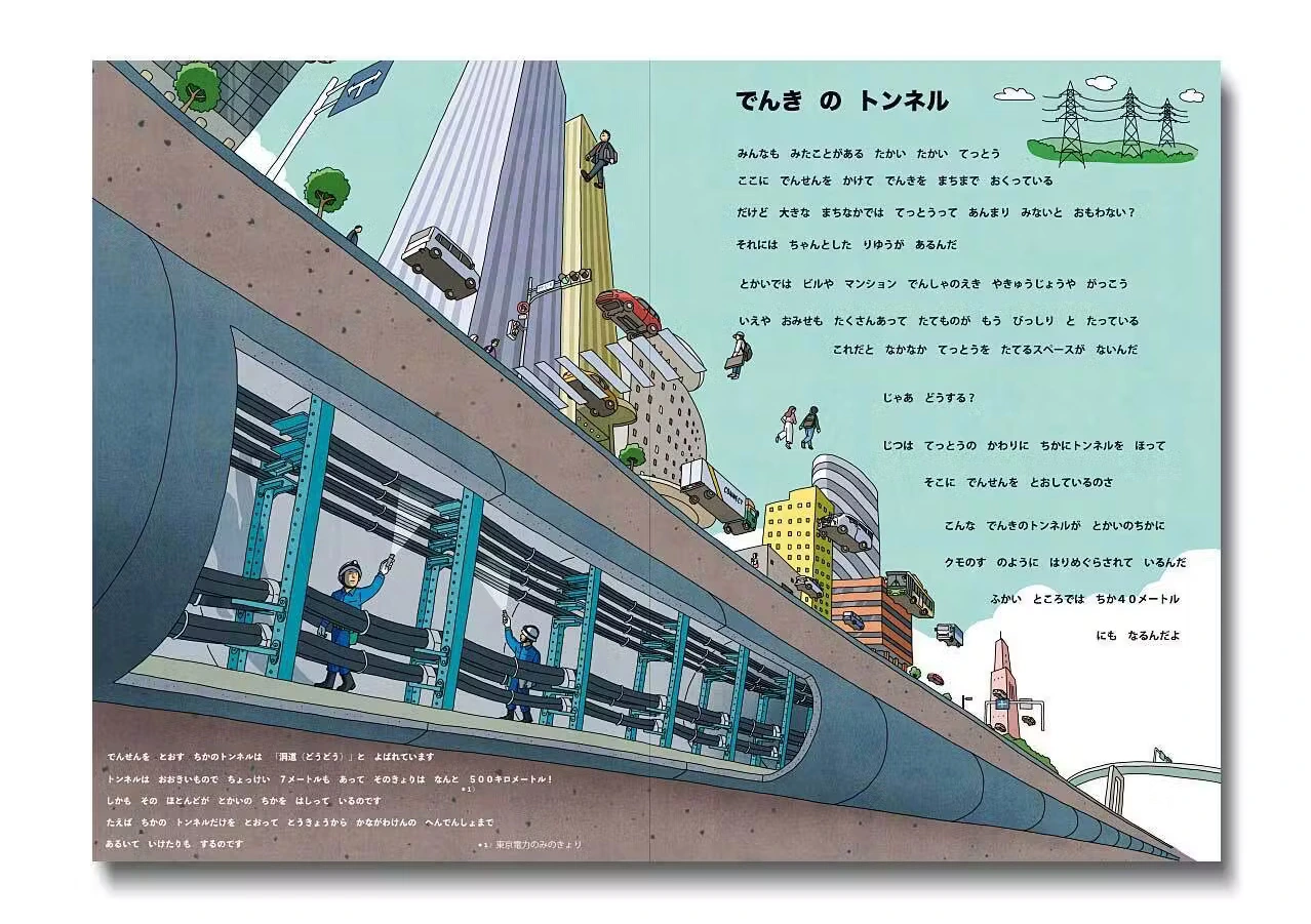 「トウキョウ」の街と地下空間を大胆にカット(切る)し、その不思議な世界が、とても大きなイラストで描かれています。ここを舞台に物語あり、クイズあり、街のアイテムの解説ありと、楽しさあふれる製品です。
