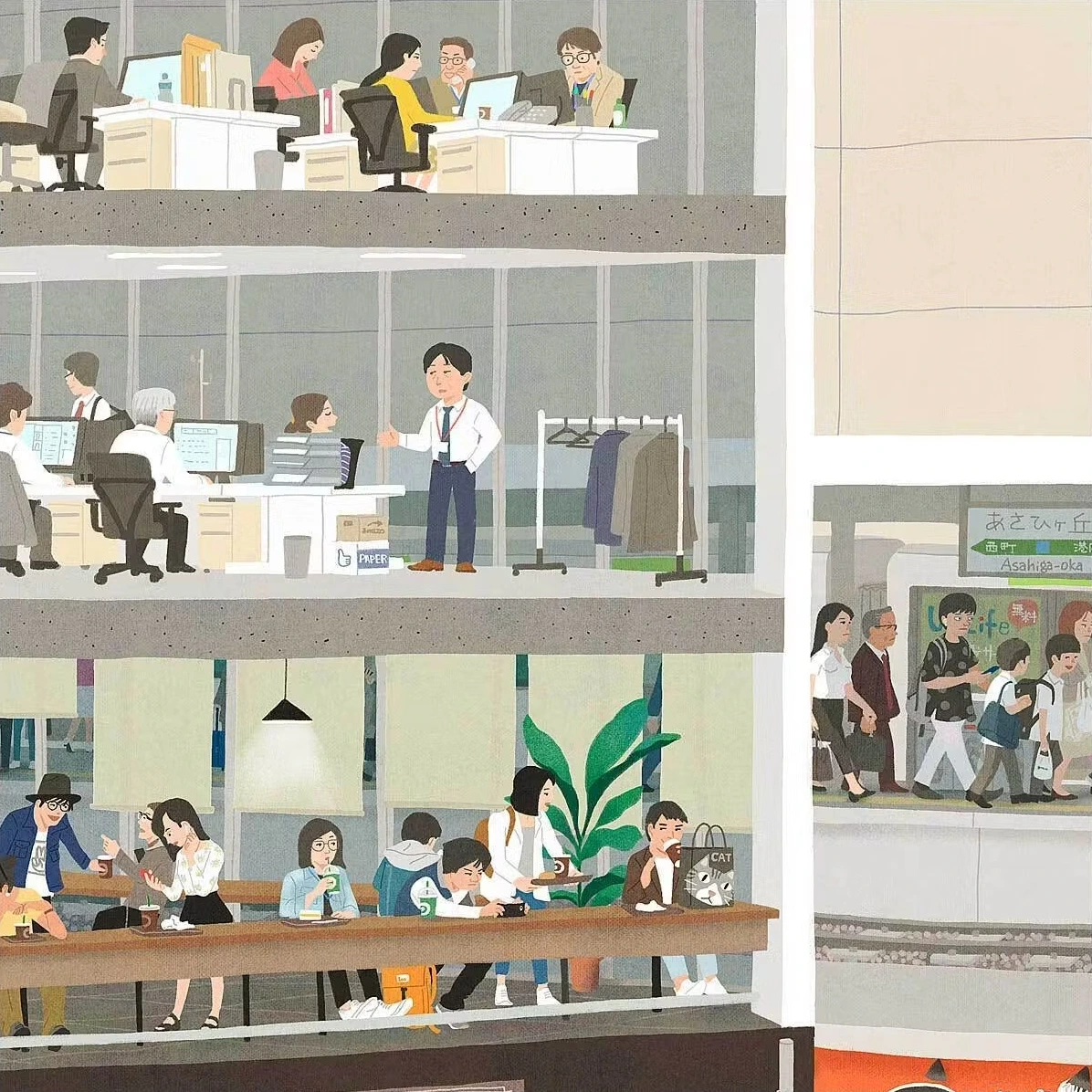 【トウキョウカット・マップ】は、大都市「トウキョウ」の地下空間をメインに、そこに広がる世界と行き交う人々を、楽しく描いているイラストポスターです。