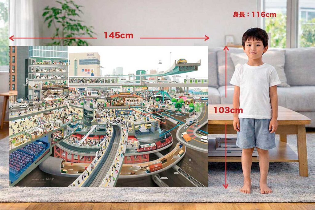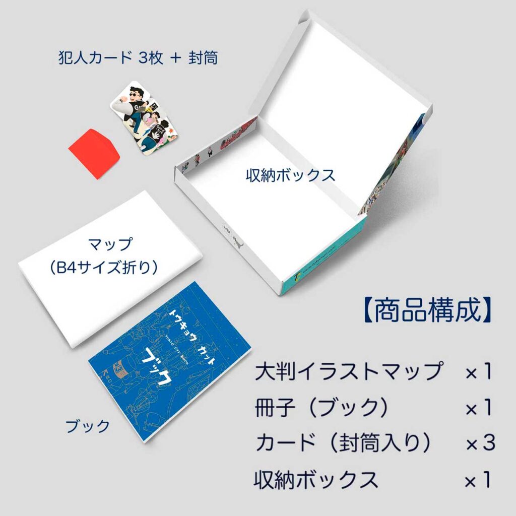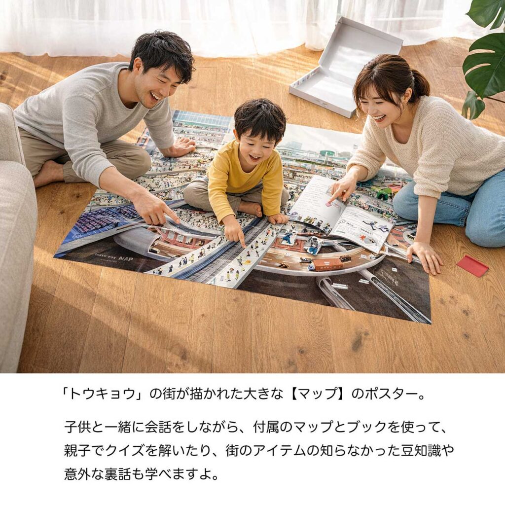 「トウキョウ」の街と地下空間を大胆にカット(切る)! その不思議な世界が、とても大きなイラストで描かれています。ここを舞台に物語あり、クイズあり、街のアイテムの解説ありと、楽しさあふれる製品です。例えるなら「1枚の大きな絵本」と呼んでいいかもしれません。